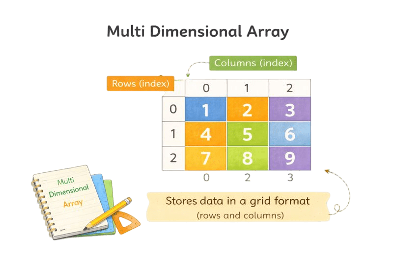 A multi-dimensional array stores data in rows and columns, like a table.