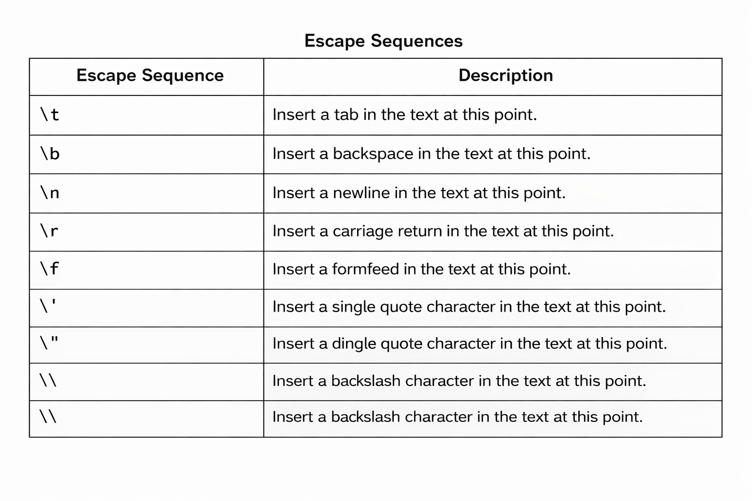 System.out.println("Path: C:\\Java");    // \\ → backslash