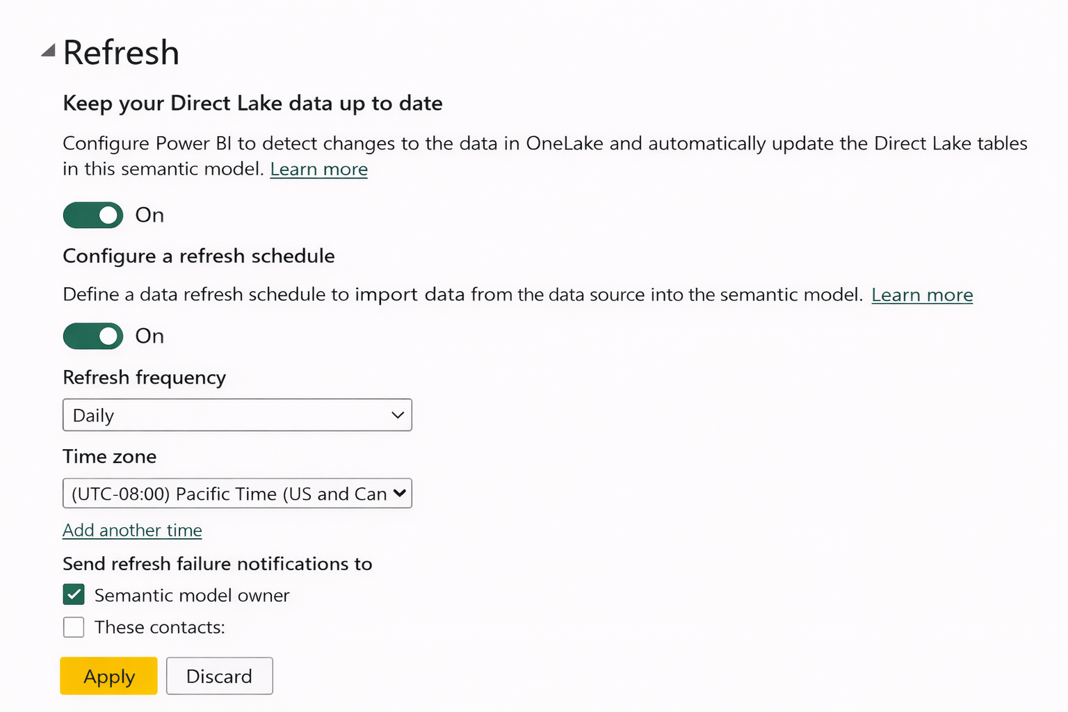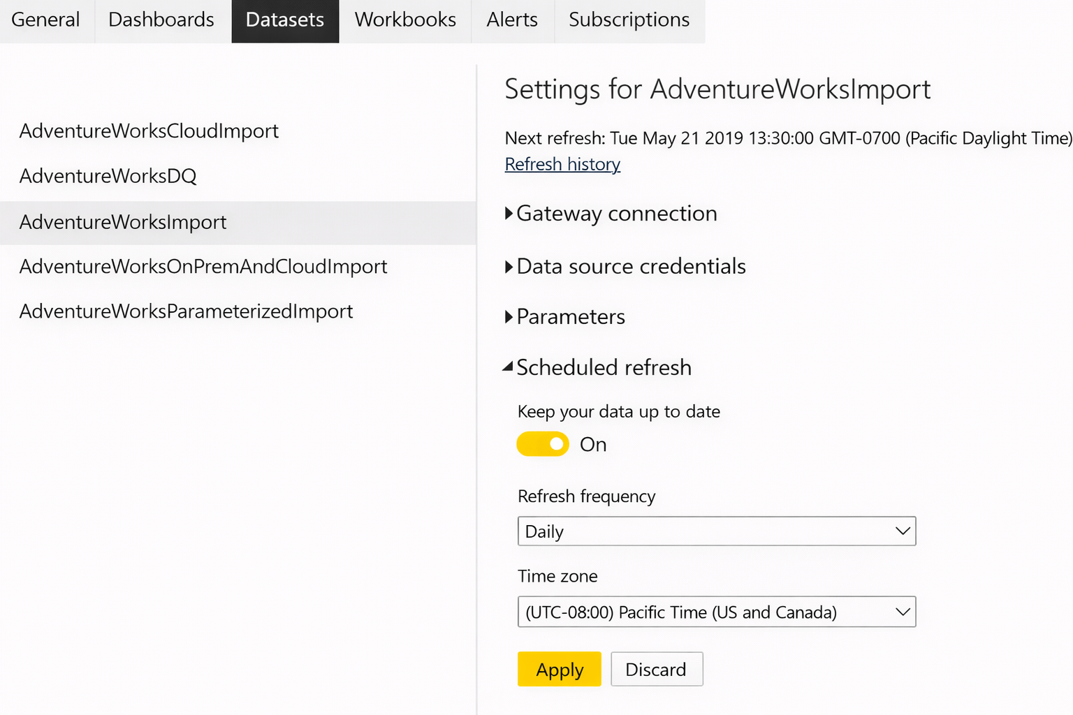Scheduled refresh is configured at the dataset level.