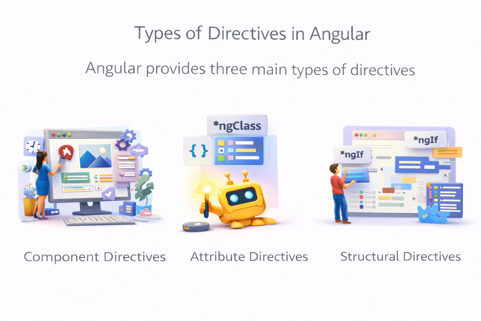 Angular provides three main types of directives