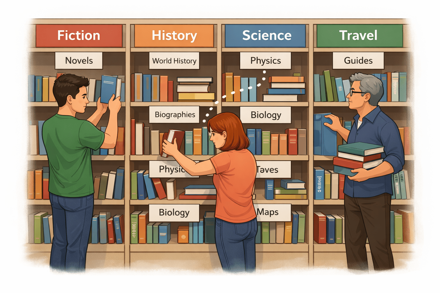 Books are arranged in categories