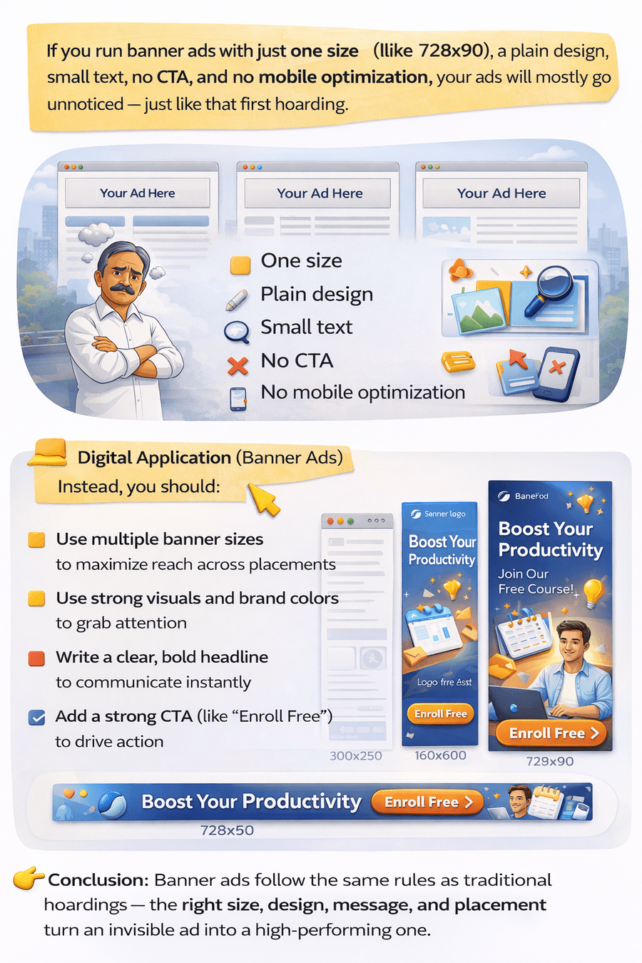 Banner ads follow the same rules as traditional hoardings — the right size, design, message, and placement turn an invisible ad into a high-performing one.