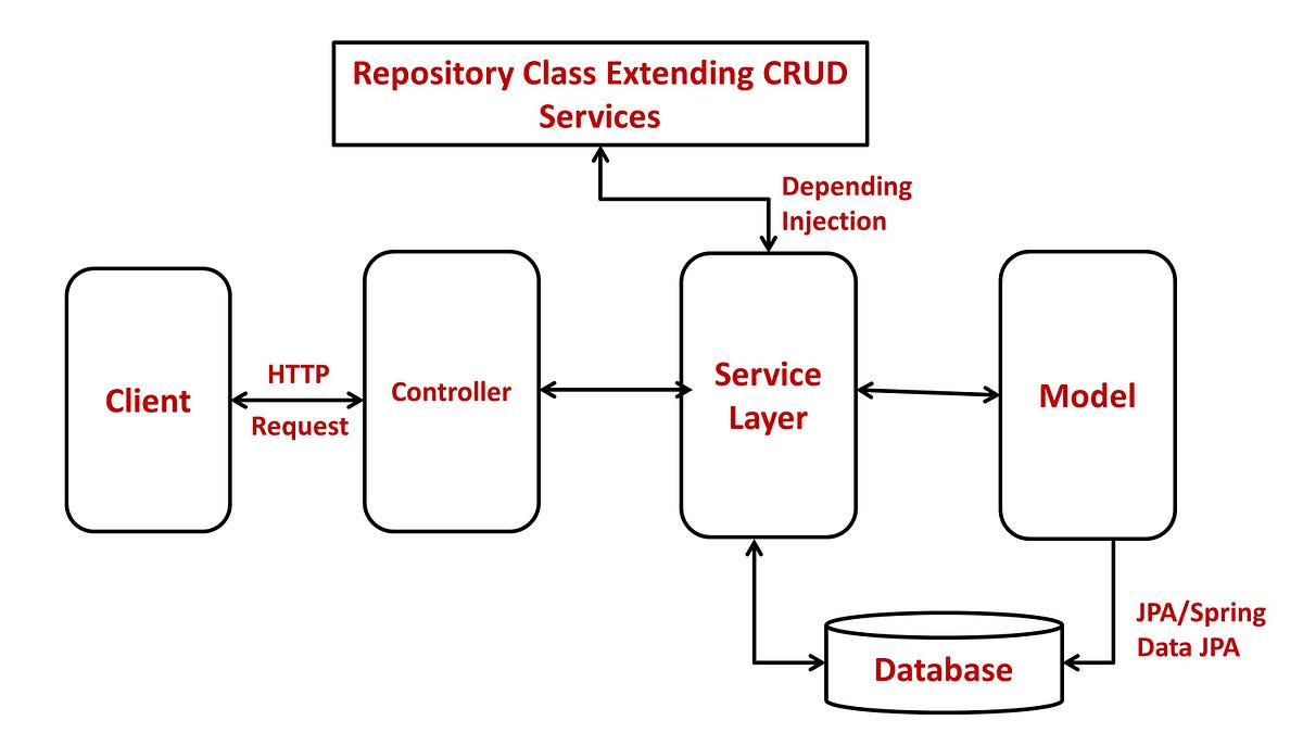 Response flows from Database to Repository to Service to Controller to Client.