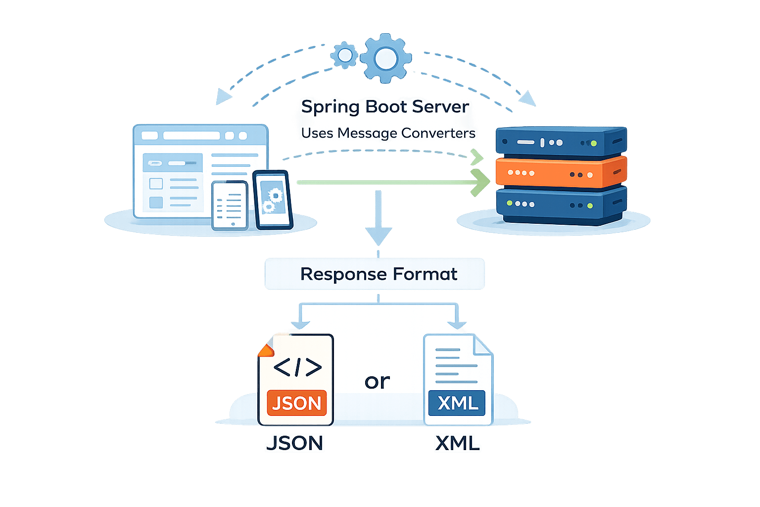 Message Converters – Spring Boot uses built-in message converters to convert Java objects into the requested format like JSON or XML.