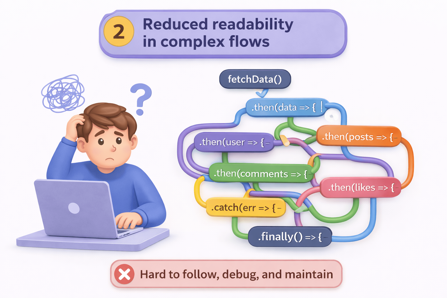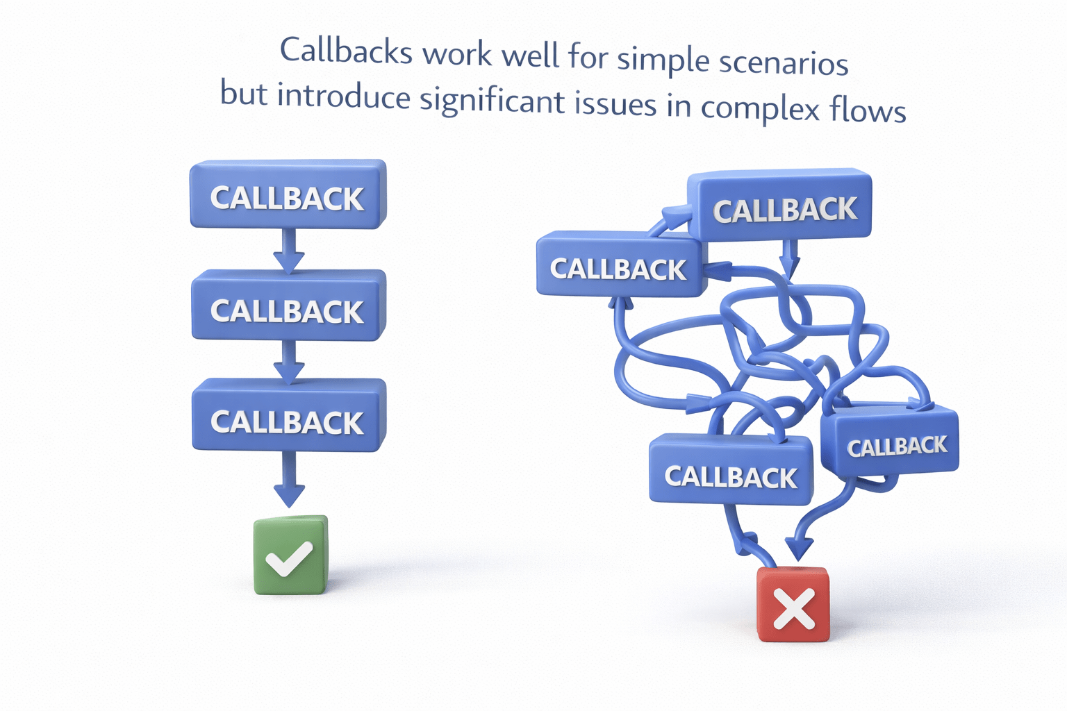 Callbacks work well for simple scenarios but introduce significant issues in complex flows
