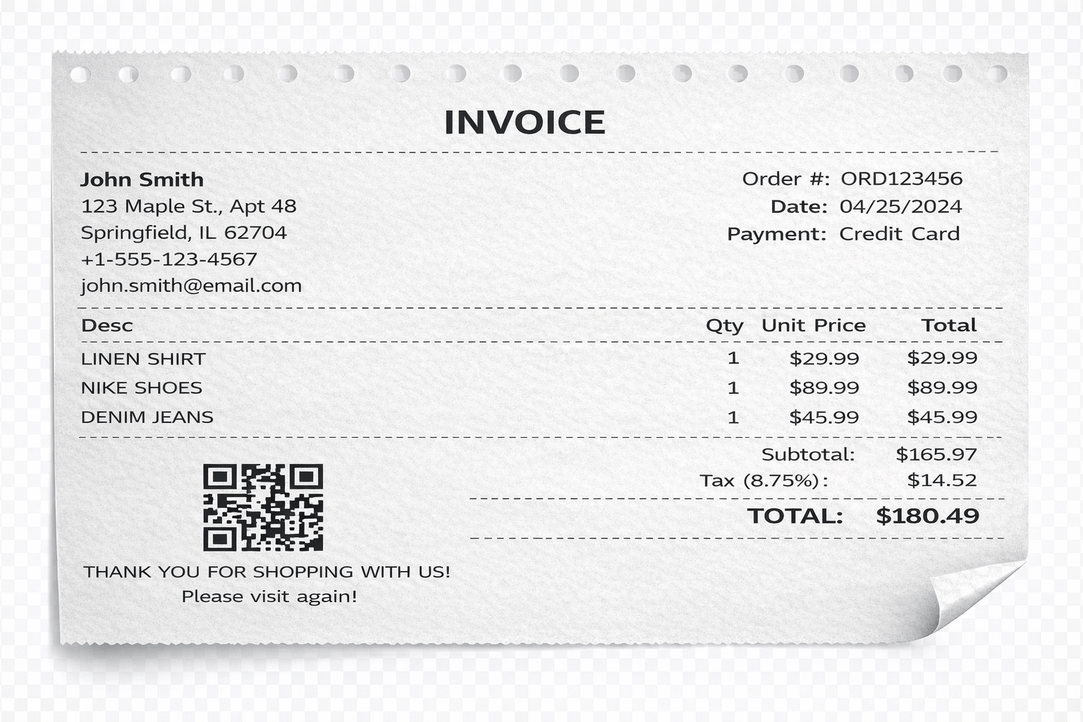 After placing the order, a bill or invoice is generated containing customer details, product details, and order details