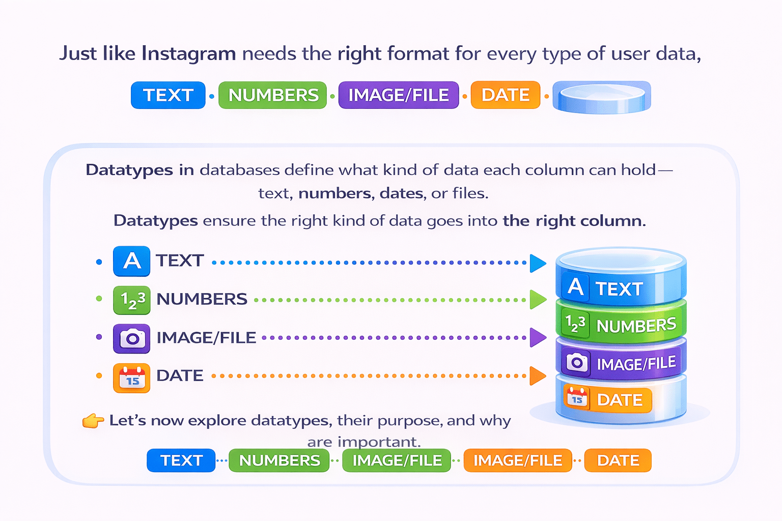 Datatypes in databases define what kind of data each column can hold— text, numbers, dates, or files