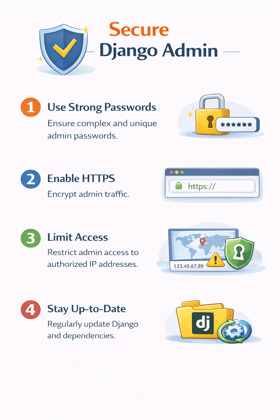 • Regularly update Django and dependencies.