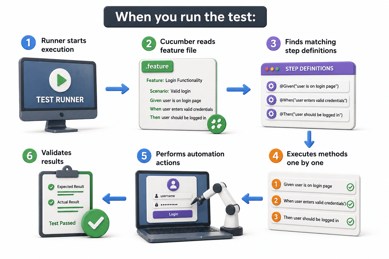 Step definitions = the actual driving instructions (how it happens)
