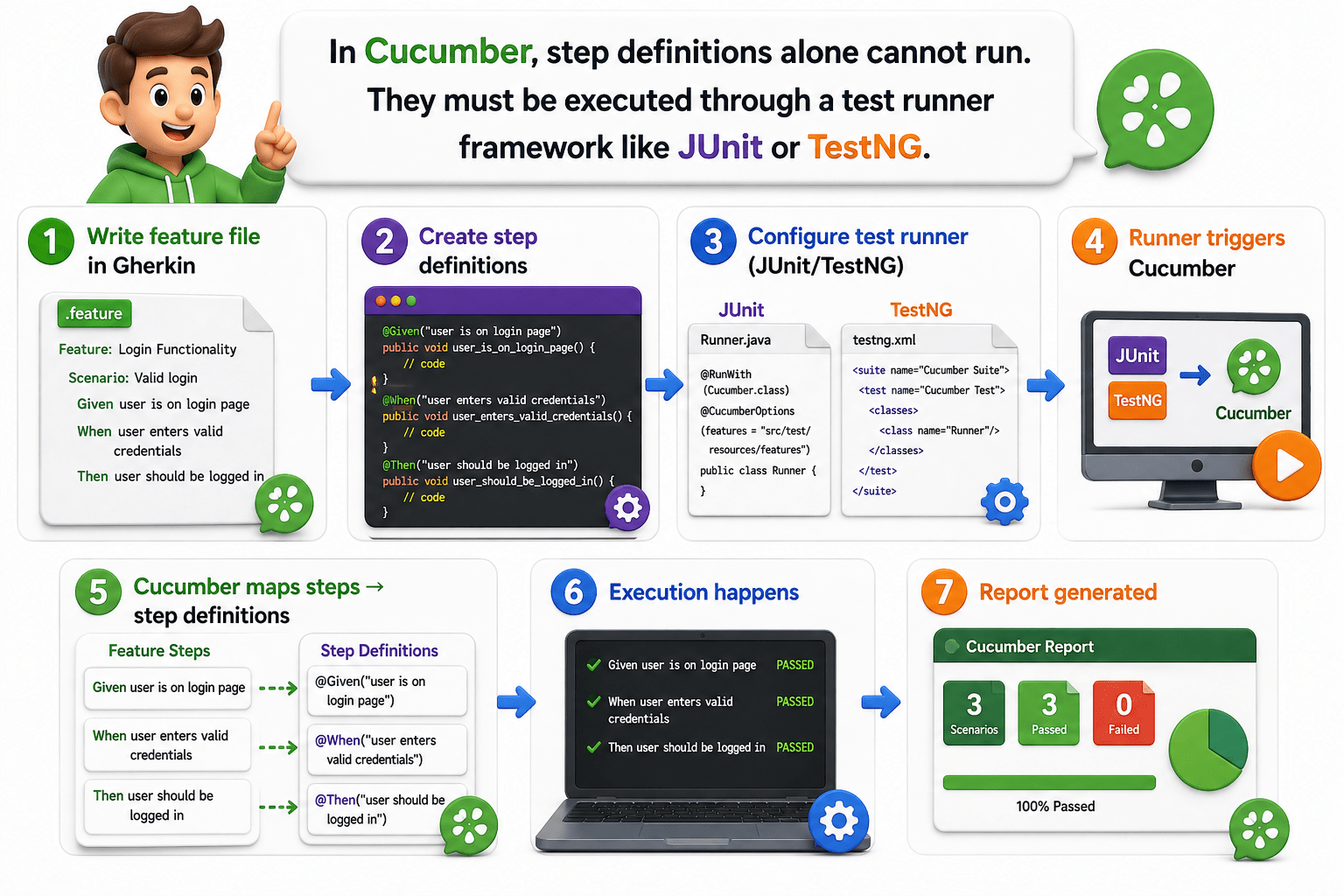 In Cucumber, step definitions alone cannot run. They must be executed through a test runner framework like JUnit or TestNG.