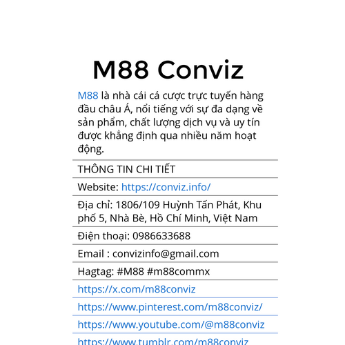 M88 là nhà cái cá cược trực tuyến hàng đầu châu Á, nổi tiếng với sự đa dạng về sản phẩm, chất lượng dịch vụ và uy tín được khẳng định qua nhiều năm hoạt động. Website: https://conviz.info/