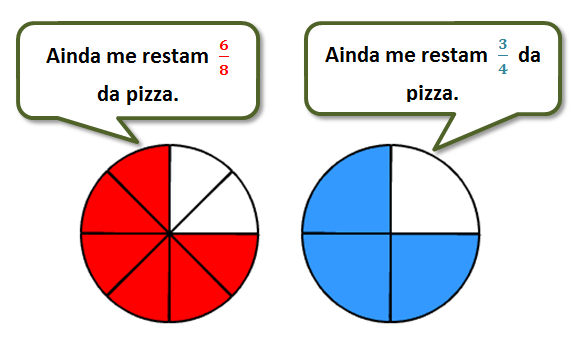 “Se eu divido uma pizza em 2 pedaços e como 1, comi metade. Mas se eu dividir a mesma pizza em 4 pedaços e comer 2, continuo comendo metade. Ou seja, 1/2 e 2/4 são a mesma quantidade, só que representadas de formas diferentes.”