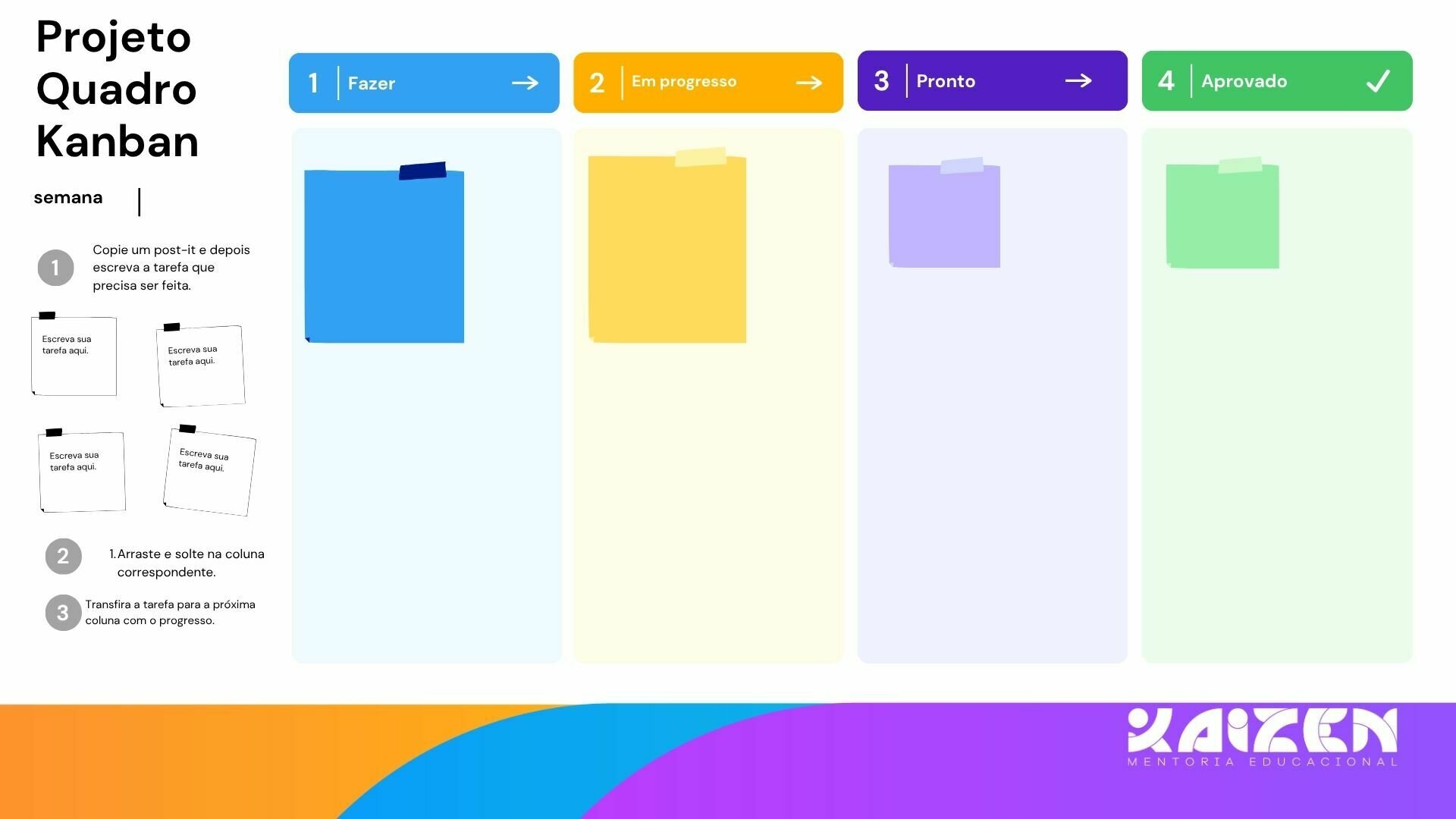 Para mentorias com estudantes mais novos, não utilizamos a planilha de metas convencional. Para eles, nós utilizamos uma estrutura visual chamada Kanban. Nosso quadro fica assim: