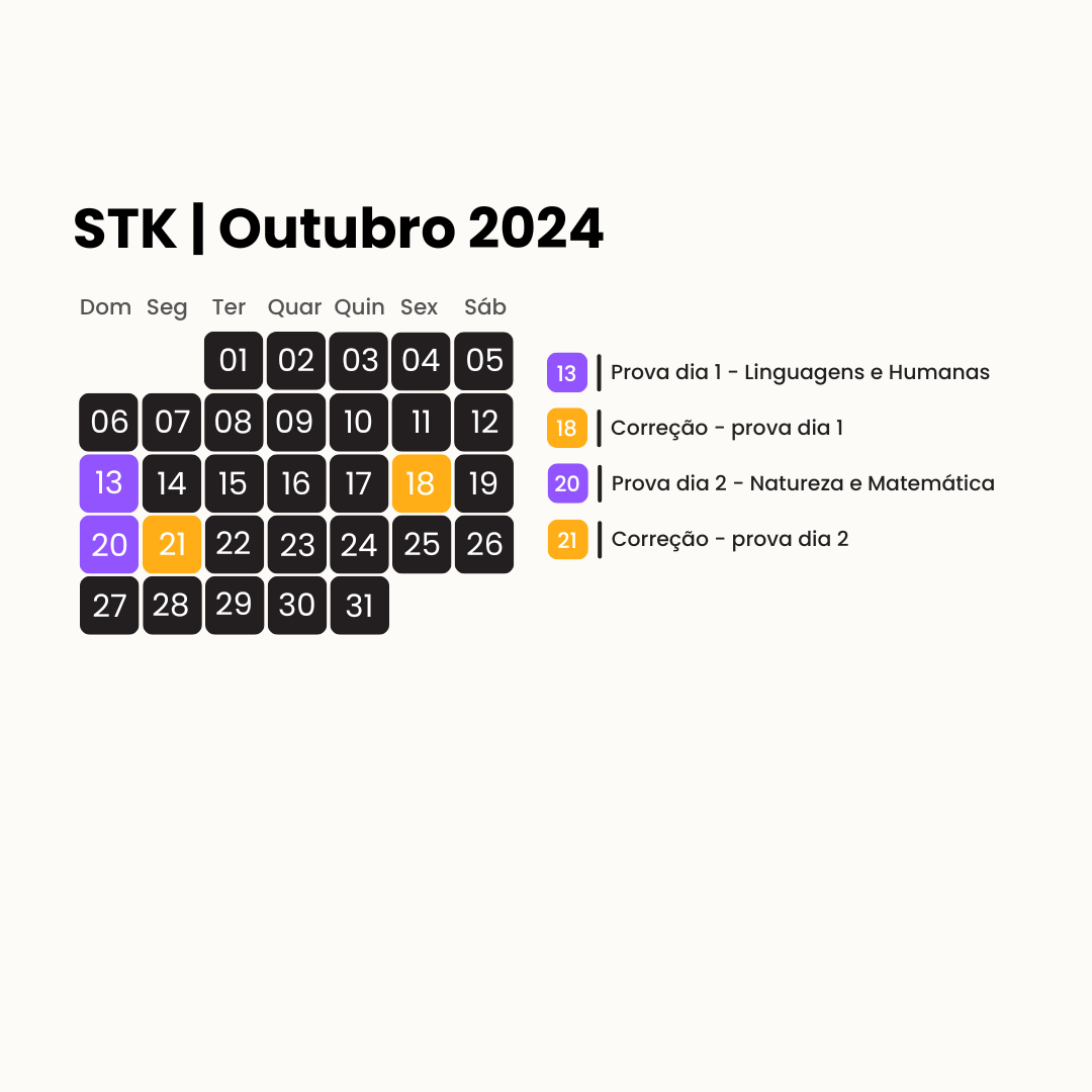 A aplicação do STK dura dois dias, que são definidos pela equipe da Kaizen de acordo com os calendários escolares. Chamamos o primeiro dia (humanas e linguagens) de D1 e o segundo dia (natureza e matemática) de D2.