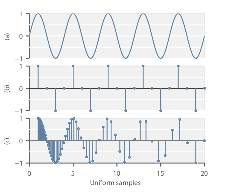1. Acquire the signal at a uniform sample rate Fs=44100 Hz. Signal is discrete now.