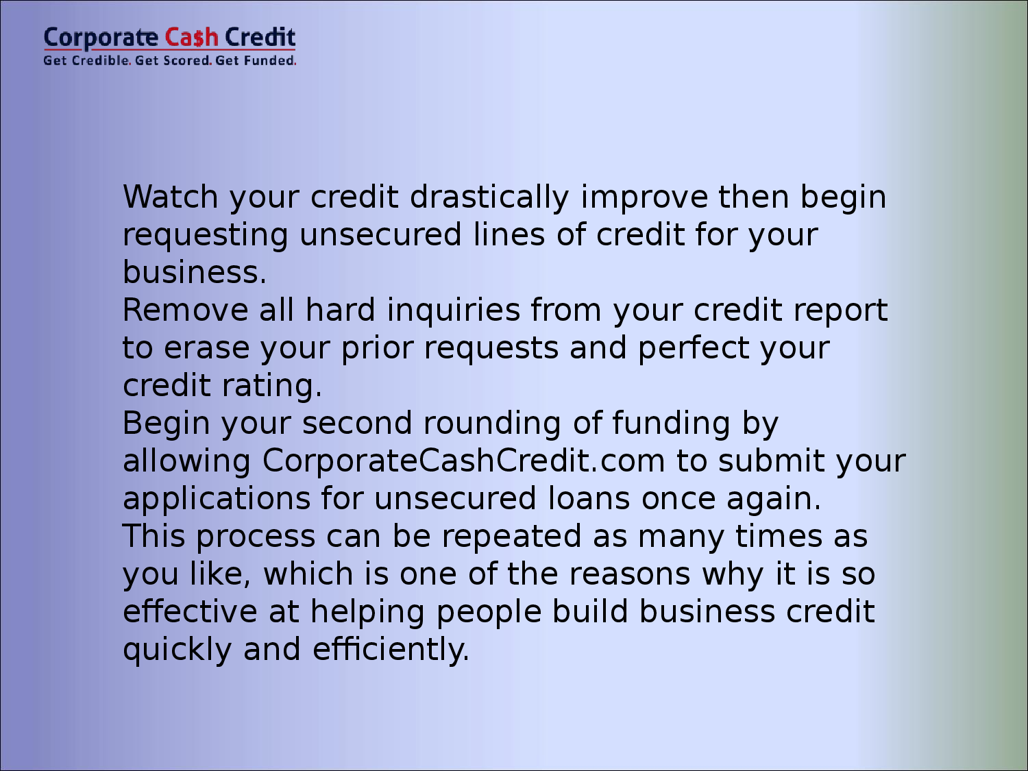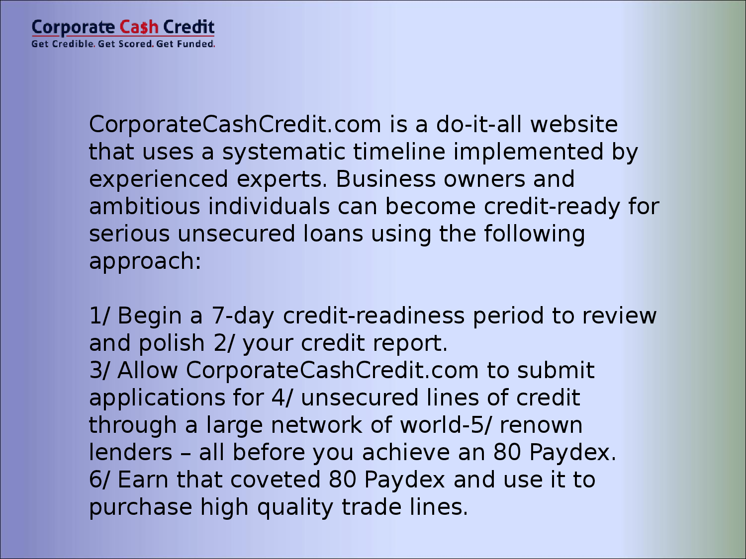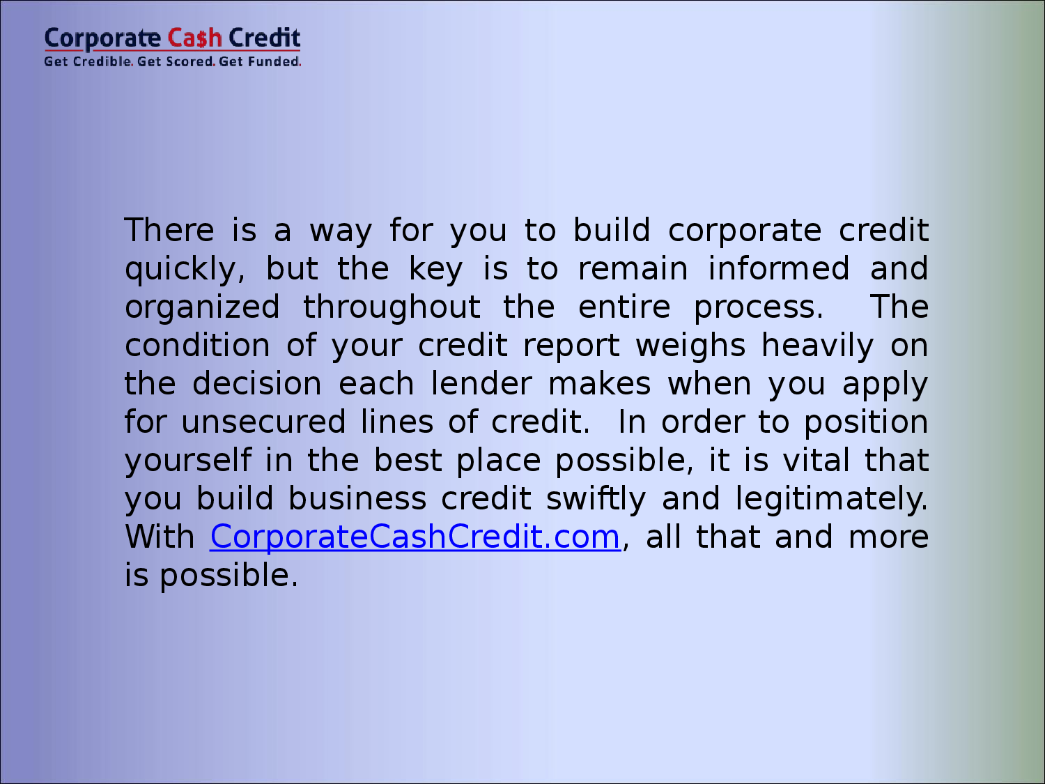 There is a way for you to build corporate credit quickly, but the key is to remain informed and organized throughout the entire process. The condition of your credit report weighs heavily on the decision each lender makes when you apply for unsecured lines of credit. In order to position yourself in the best place possible, it is vital that you build business credit swiftly and legitimately. With CorporateCashCredit.com, all that and more is possible.