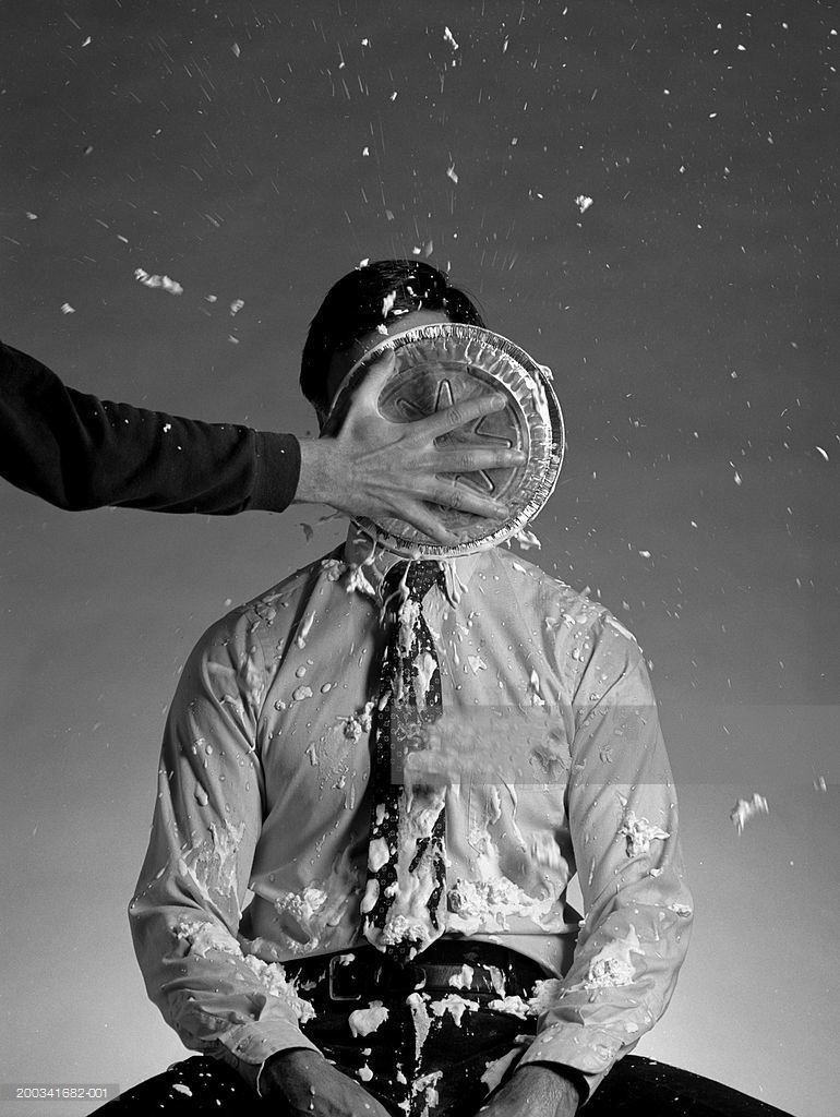 Losing captain has to take a pie to the face from winning team captain at the annual production meeting
