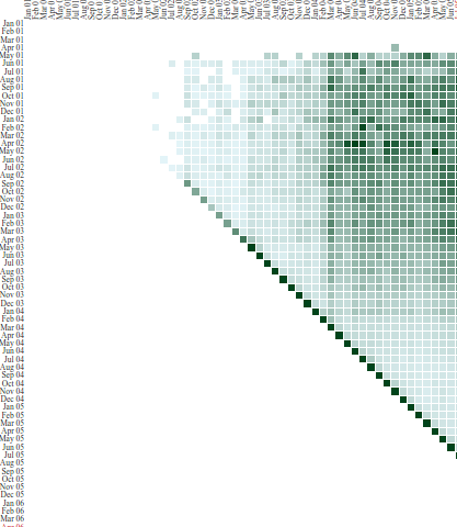 Editor retention rates - en. We can pick declines & spikes in monthly activity by looking at the vertical streaks of green & red. The spike are caused when a lot of older cohorts suddenly get active & the declines are similarly when their activity falls.