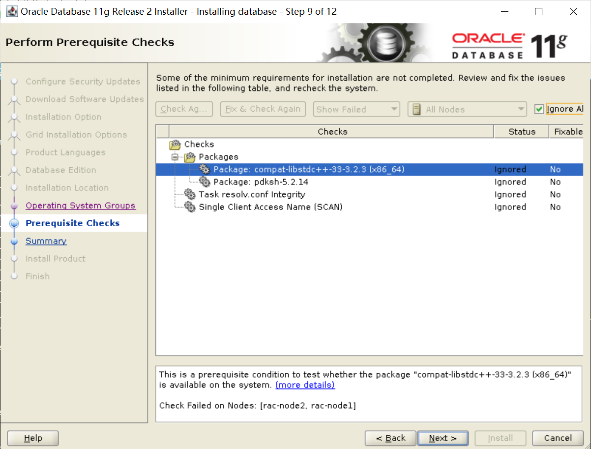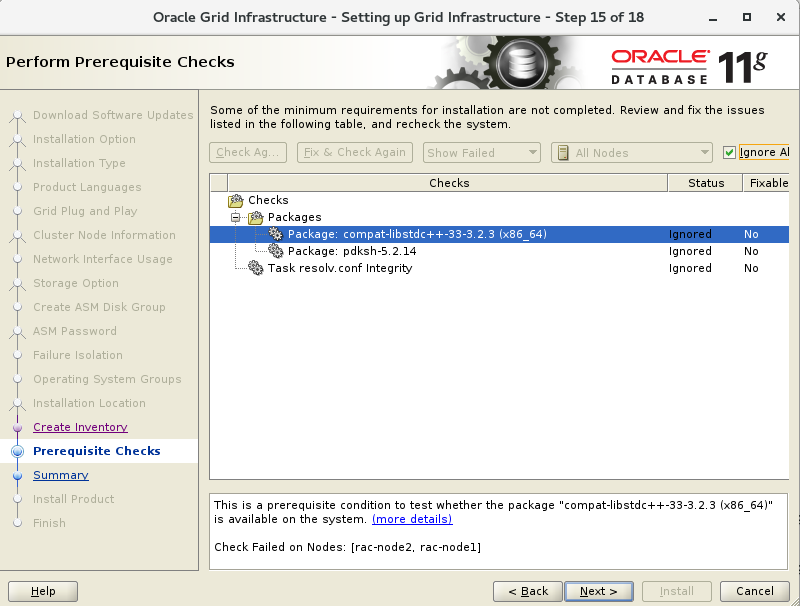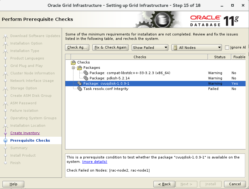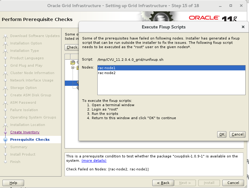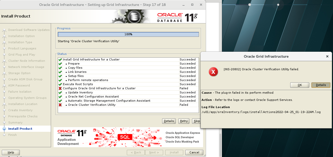 安装进程100%报:INFO: Oracle Cluster Verification Utility failed.