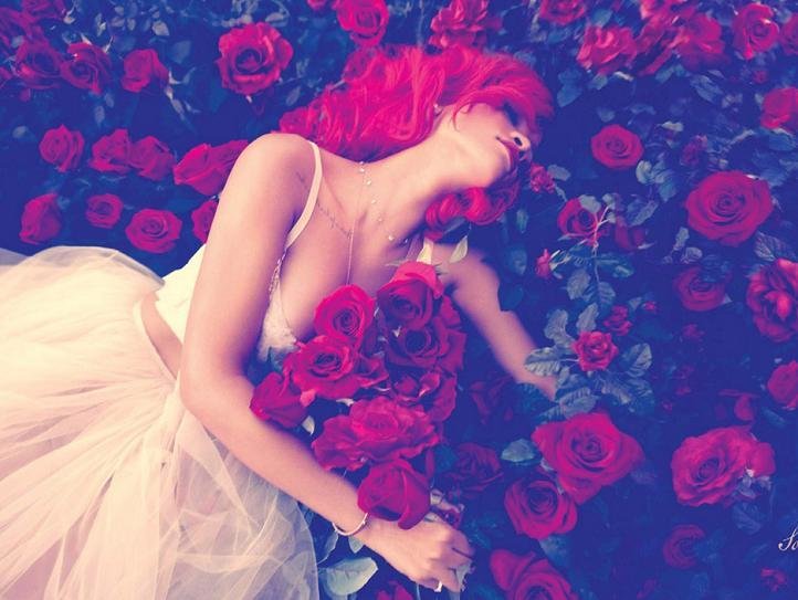 The theme of love is continued onto the threesided section where Rihanna is found lying into a bed of roses.This page entices the audience to know the story of the artist on the front cover who now seems distressed layed down. A narrative enigma is created to what happened to the artist. The large image inside the digipack presents allot of emotion through the use of the busy background of a bed of roses. The boldness and vibrance of the red roses alongside the body language of Rihanna create a sense of weakness and heartbreak. Sex appeall is present through the revealing crop top the artist is wearing , this is also seen on the album front cover, the red lipstick is very seductive conforming to the male gaze theory drawing attention from male audiences to her mouth.
