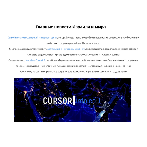 https://cursorinfo.co.il/ Cursorinfo - это израильский интернет-портал, который оперативно, подробно и независимо оповещает вас об основных событиях, которые произойти в Израиле и мире. Вместе с нами предлагаем узнавать актуальные и интересные новост