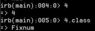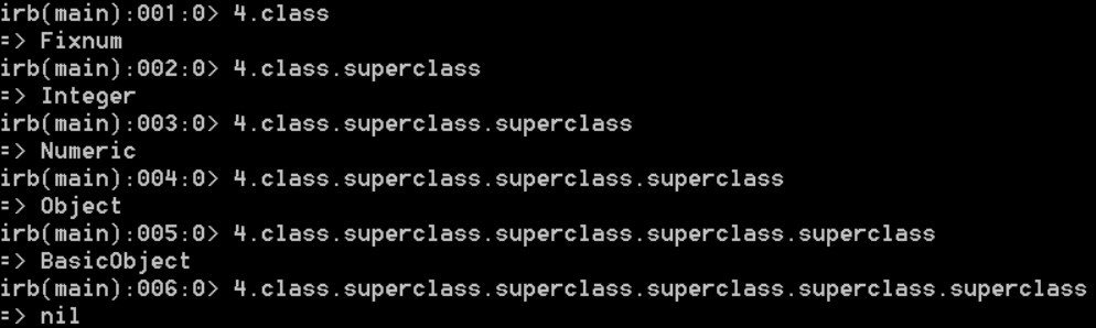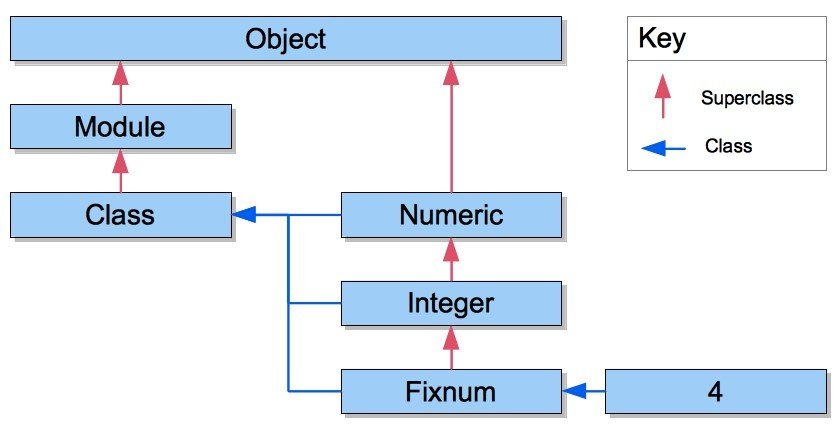 As you can see, the 4’s class is Fixnum, which inherits from Integer, Numeric, Object and BasicObject.