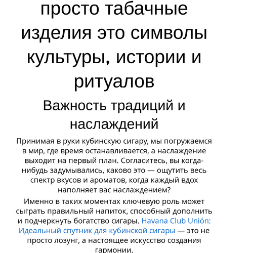 Именно в таких моментах ключевую роль может сыграть правильный напиток, способный дополнить и подчеркнуть богатство сигары. Havana Club Unión: Идеальный спутник для кубинской сигары — это не просто лозунг, а настоящее искусство создания гармонии.