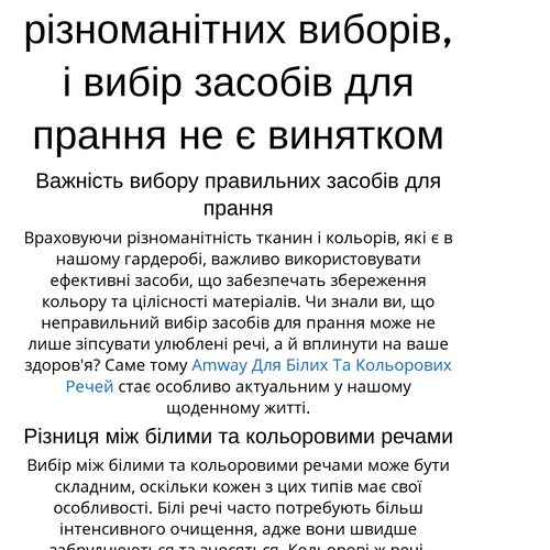 Враховуючи різноманітність тканин і кольорів, які є в нашому гардеробі, важливо використовувати ефективні засоби, що забезпечать збереження кольору та цілісності матеріалів. Чи знали ви, що неправильний вибір засобів для прання може не лише зіпсувати улюблені речі, а й вплинути на ваше здоров'я? Саме тому Amway Для Білих Та Кольорових Речей стає особливо актуальним у нашому щоденному житті.