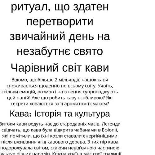 Відомо, що більше 2 мільярдів чашок кави споживається щоденно по всьому світу. Уявіть, скільки емоцій, розмов і натхнення супроводжують цей напій! Але що робить каву особливою? Які секрети ховаються за її ароматом і смаком?