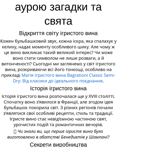 Кожен бульбашковий звук, кожна іскра, яка спалахує у келиху, надає моменту особливого шику. Але чому ж це вино викликає такий великий інтерес? Чи може воно стати символом не лише розваги, а й витонченості? Сьогодні ми заглянемо у світ ігристого вина, розкриваючи всі його тонкощі, особливо на прикладі Магія ігристого вина Bagrationi Classic Semi-Dry: Від класики до ідеального поєднання.