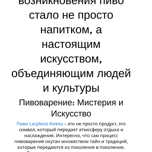 Факты: Пиво считалось даром богов, его использовали в ритуалах и праздниках. В Европе пивоварение стало особенно популярным в средние века, когда монастыри стали центрами производства. Здесь пиво Lacplesis Kviesu найдет свое достойное место среди традиционных сортов, ведь каждый из них несет в себе часть истории.