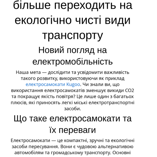 Наша мета — дослідити та усвідомити важливість такого розвитку, використовуючи як приклад електросамокати Kugoo. Чи знали ви, що використання електросамокатів зменшує викиди CO2 та покращує якість повітря? Це лише один з багатьох плюсів, які приносять легкі міські електротранспортні засоби.