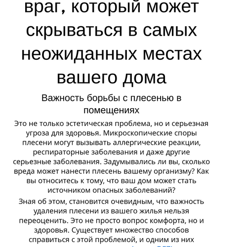 Плесень — это не просто косметическая проблема, а серьезный враг для вашего здоровья. Понимание причин ее появления, методов распознавания и профилактических мер поможет вам защитить свой дом и себя. Короткие сроки, потраченные на профилактику и удаление плесени, обеспечат вам комфортное и безопасное пространство для жизни. Заботьтесь о своем здоровье и здоровье ваших близких — ваше жилье должно быть безопасным оазисом, свободным от плесени.