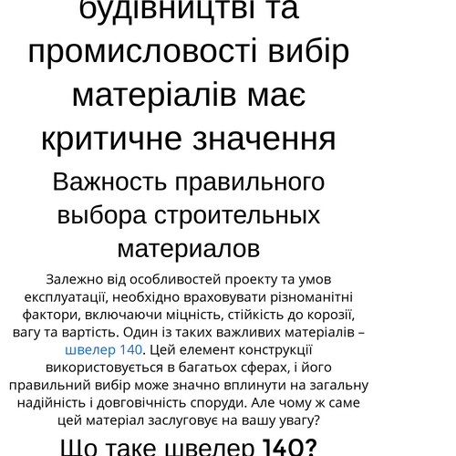 Залежно від особливостей проекту та умов експлуатації, необхідно враховувати різноманітні фактори, включаючи міцність, стійкість до корозії, вагу та вартість. Один із таких важливих матеріалів – швелер 140. Цей елемент конструкції використовується в багатьох сферах, і його правильний вибір може значно вплинути на загальну надійність і довговічність споруди. Але чому ж саме цей матеріал заслуговує на вашу увагу?