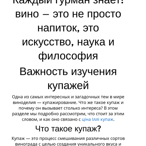 Одна из самых интересных и загадочных тем в мире виноделия — купажирование. Что же такое купаж и почему он вызывает столько интереса? В этом разделе мы подробно рассмотрим, что стоит за этим словом, и как оно связано с ціна Іллі купаж.
