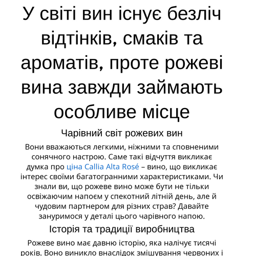 Рожеве вино – це не просто напій, це цілий світ відчуттів, емоцій та золотавих спогадів. Кожна пляшка розгортає перед вами нові горизонти смаку і аромату, які варто досліджувати. Не забувайте, що ціна Callia Alta Rosé може стати чудовим доповненням до вашого винахідливого меню чи святкового столу.
