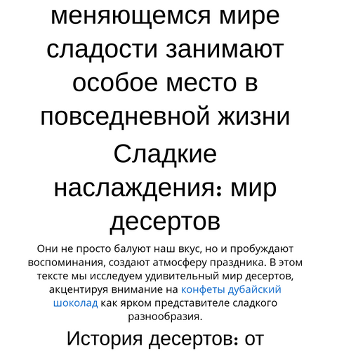 Каждый десерт, в том числе конфеты дубайский шоколад, имеет свою уникальную историю и место в культуре. Сладости не только радуют нас, но и становятся символами праздника, любви и единства. Мир десертов удивителен и многообразен, и каждый может найти что-то по душе, добавляя кусочек счастья в свою жизнь.