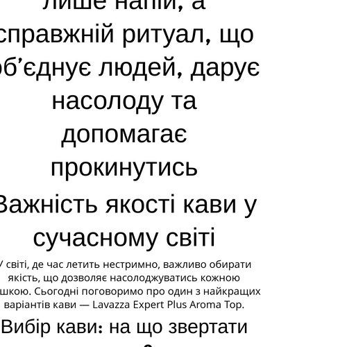 У світі, де час летить нестримно, важливо обирати якість, що дозволяє насолоджуватись кожною чашкою. Сьогодні поговоримо про один з найкращих варіантів кави — Lavazza Expert Plus Aroma Top.