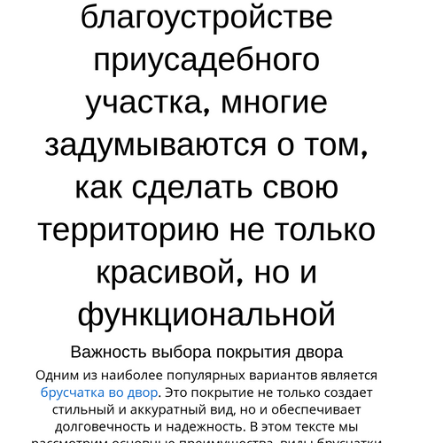 Обустраивая двор, важно выбрать качественное и долговечное покрытие. брусчатка во двор — это идеальный вариант, который сочетает в себе эстетичность, функциональность и надежность. С правильным подходом к выбору и укладке, ваш двор станет настоящей визитной карточкой вашего дома, радуя глаз и создавая уют.