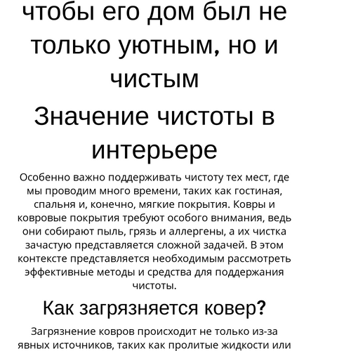 Особенно важно поддерживать чистоту тех мест, где мы проводим много времени, таких как гостиная, спальня и, конечно, мягкие покрытия. Ковры и ковровые покрытия требуют особого внимания, ведь они собирают пыль, грязь и аллергены, а их чистка зачастую представляется сложной задачей. В этом контексте представляется необходимым рассмотреть эффективные методы и средства для поддержания чистоты.
