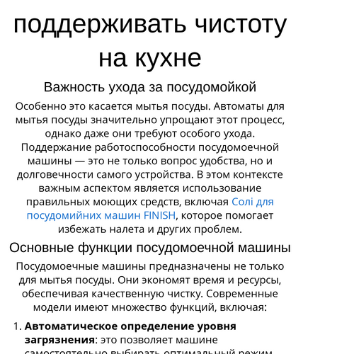 Особенно это касается мытья посуды. Автоматы для мытья посуды значительно упрощают этот процесс, однако даже они требуют особого ухода. Поддержание работоспособности посудомоечной машины — это не только вопрос удобства, но и долговечности самого устройства. В этом контексте важным аспектом является использование правильных моющих средств, включая Солі для посудомийних машин FINISH, которое помогает избежать налета и других проблем.