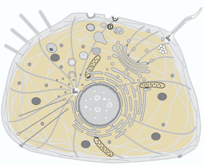 Mitochondria, endoplasmic reticulum, golgi apparatus, lysosomes, peroxisomes, vacuoles, endosomes, ribosomes, centrosomes, . . .