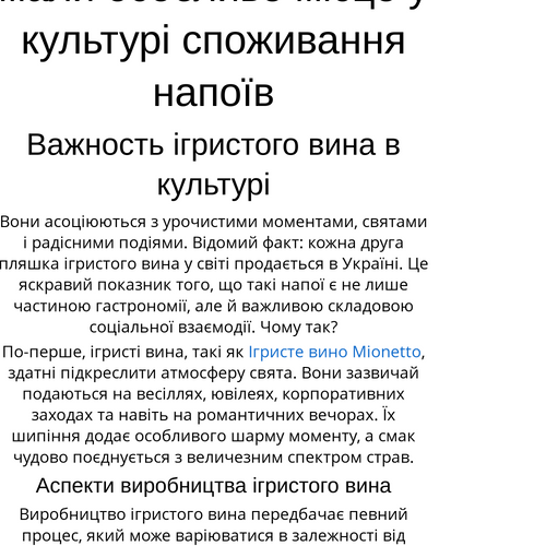 Ігристі вина — це не лише напій, але й символ радості та об'єднання людей. Коли ми піднімемо келих за здоров'я, це творить зв'язок між людьми, наповнюючи атмосферу позитивом.