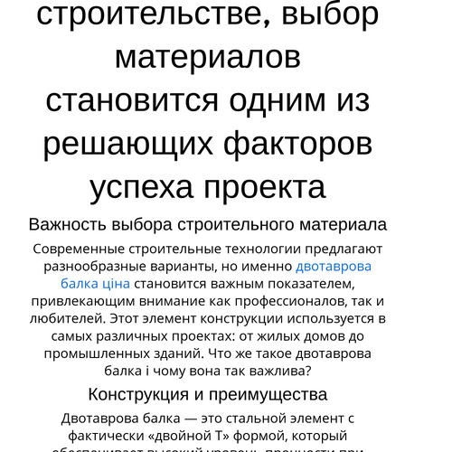 Современные строительные технологии предлагают разнообразные варианты, но именно двотаврова балка ціна становится важным показателем, привлекающим внимание как профессионалов, так и любителей. Этот элемент конструкции используется в самых различных проектах: от жилых домов до промышленных зданий. Что же такое двотаврова балка і чому вона так важлива?