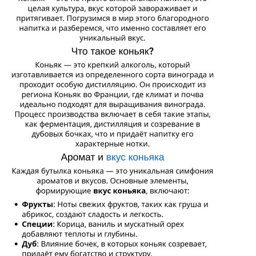 Коньяк — это не просто алкогольный напиток, это целая культура, вкус которой завораживает и притягивает. Погрузимся в мир этого благородного напитка и разберемся, что именно составляет его уникальный вкус.