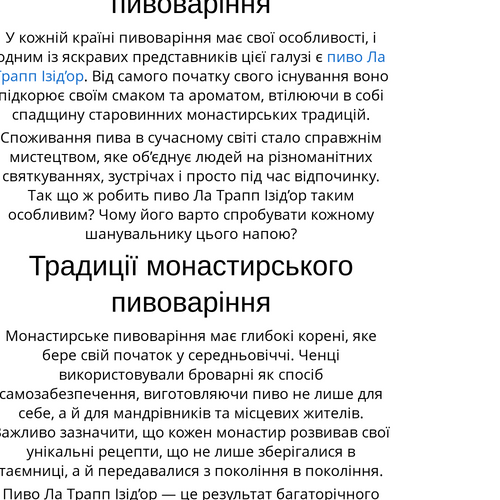 💡 Не бійтеся експериментувати та шукати нові смаки, адже кожен ковток пива Ла Трапп Ізід’ор — це нова історія, яку варто розповісти.