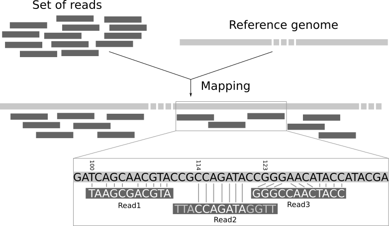 Sequencing reads are matched to a reference genome to determine their correct positions
