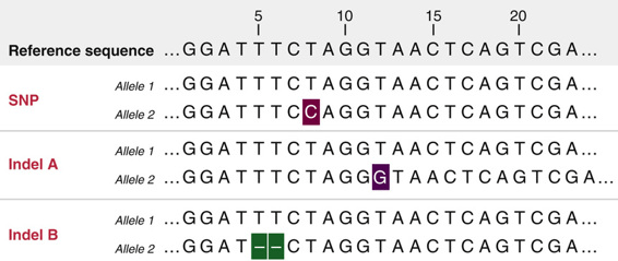 Single-nucleotide polymorphisms (SNPs) are single base changes between the read and the reference