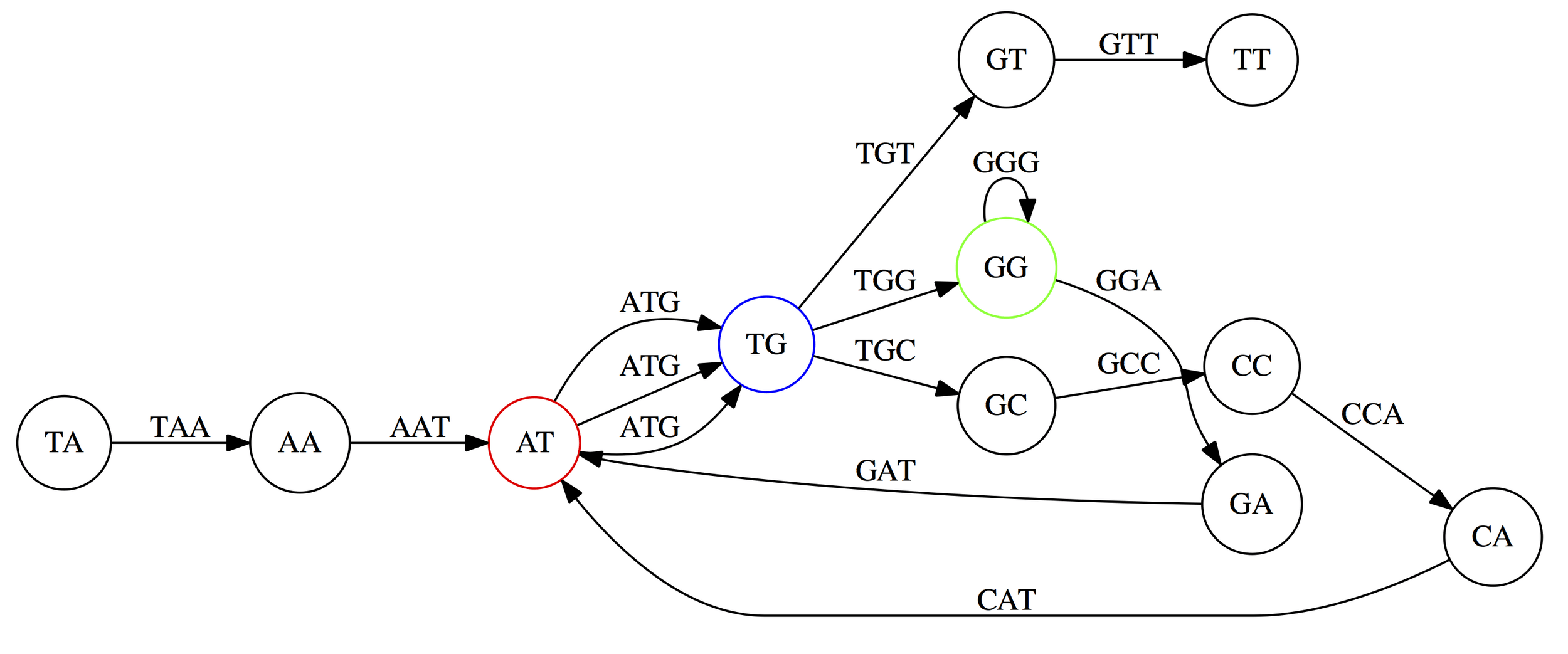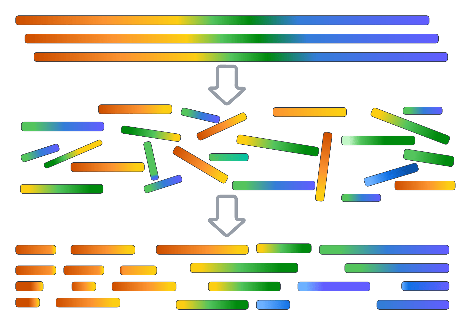 Overlap information is used to merge reads into contiguous DNA sequences called contigs