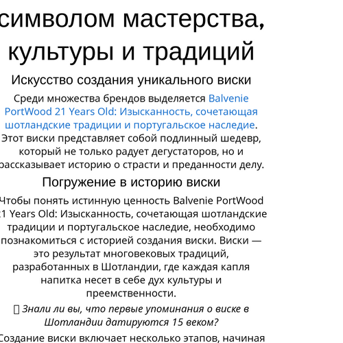Виски не просто напиток; это часть культуры и традиций, которые соединяют людей. Balvenie PortWood 21 Years Old: Изысканность, сочетающая шотландские традиции и португальское наследие, идеально подходит для совместных застольев и праздников.